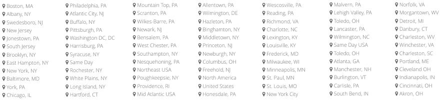 Portland· ME · WA DC · Northeast USA · Mid-West USA · Mid Atlantic USA · Swedesboro· NJ · Jonestown· PA · Moon Twp· PA · Carlisle· PA · Hagerstown· MD · Lebanon· PA · Frystown· PA · Frederick· MD · Fredericksburg· PA · Odenton· MD · North East· MD · Atlantic City· NJ · Cambridge· MA · Newton· MA · Newtown Square· PA · Yardley· PA · King of Prussia· PA · Collegeville· PA · Southampton· NY · East Hampton· NY · The Hamptons· NY · Atlanta· GA · Louisville· KY · Orlando· FL · Oaks· PA · West Chester· PA · White Plains· NY · New York· NY Nationwide LOCATIONS: · Myerstown· PA · Easton· PA · Bethlehem· PA · Whitehall· PA · South Philly· PA · Arlingotn· VA · Alexandria· VA · Sterling· VA · Dover· DE · Newark· DE · Morgantown· WV · Chambersburg· PA · Lancaster· PA · Manheim· PA · Altoona· PA · Fresno· CA · Mountain Top· PA · Canton· OH · Indianapolis· IN · Annapolis· MD · Clearfield· PA · Caribou· PA · Mount Pocono· PA · Pocono Summit· PA · Jersey Shore· PA · Montoursville· PA · West Hazleton· PA · Shawville· PA · Shavertown· PA · Dunkirk· NY · Fredonia· NY · Dubois· PA · Newburgh· NY · New Windsor· NY · Montgomery· NY · Rock